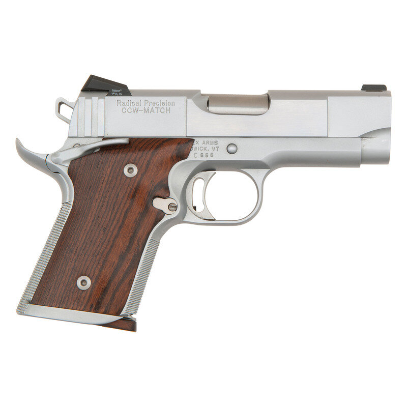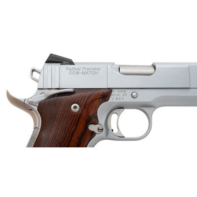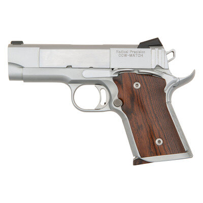 .45 ACP. 3.5" barrel. SN: C656. Bright stainless steel slide with matte stainless frame, smooth wood grips. Single action Browning design tilting-barrel short recoil magazine fed semi-automatic custom pistol. Built on an Essex Arms frame with finely checkered flat mainspring housing and front strap, extended beavertail grip that does not function as a grip safety, Schuemann Ultamitch tapered bushingless coned barrel with full-length guide rod, ambidextrous thumb safety, extended magazine, skeletonized Commander hammer, skeletonized trigger with over travel adjustment, Novak's low mount three dot night sights and a slightly flared magazine well. Includes a single magazine with a wood base plate that matches the grips. Radical Precision Designs was the company run by well known 1911 custom gunsmith Venry d'Aigullon. {MODERN}