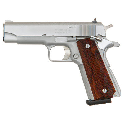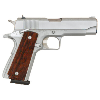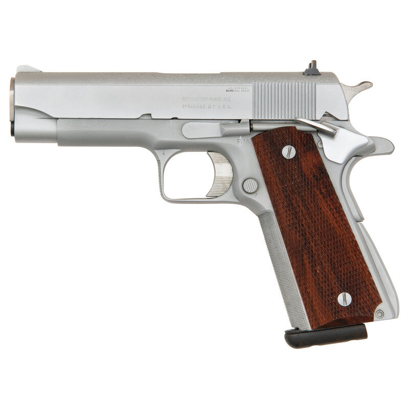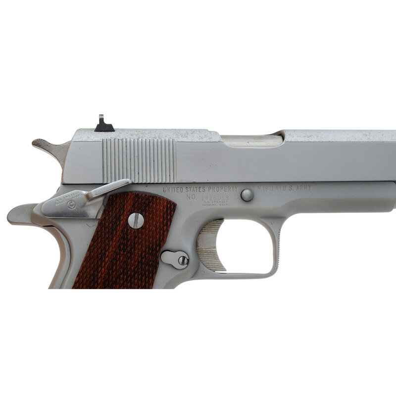 .45 ACP. 4.25" barrel length. SN: 1416068. Hard chromed finish overall with polished barrel, hammer, and bushing mounting checkered walnut grips. Short recoil operated single-action autoloading pistol fed by detachable single stack magazines and customized by Armand Swenson. Custom features include: Matted slide top with engraved border, squared and checkered triggerguard, adjustable trigger with serrated flanks, checkering to forward gripstrap, rounded edges to the frame, matted rear slide, beveled magazine well, ambidexterous and extended safety lever marked A.D. SWENSON/GARDENA CALIF. over circled C mark, full length guide rod, and matted front ramp and windage adjustable rear sights. Left slide and right frame both struck with Swenson's two-line mark. Original manufacturer marks include REMINGTON RAND INC./SYRACUSE, N.Y. U.S.A. on the left slide, UNITED STATES PROPERTY M 1911 A1 U.S. ARMY to the right frame, and the FJA initials of inspector Frank J. Atwood on the left frame. barrel shows COLT markings. Forward frame struck circle S. {MODERN}