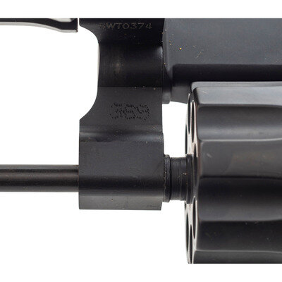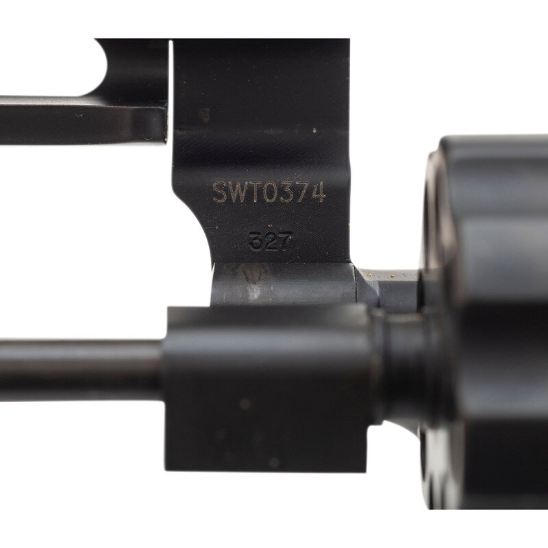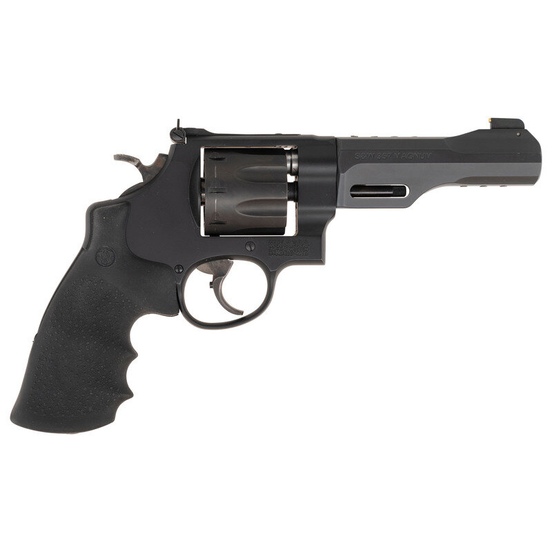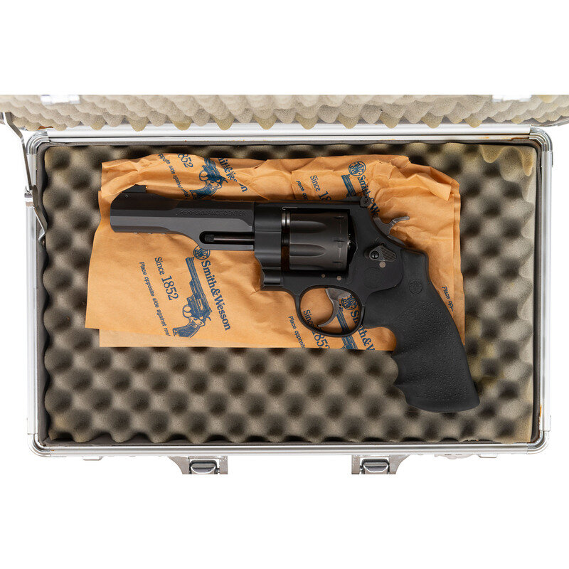.357 Magnum. 5" barrel. Blackened finish, Scandium alloy frame, steel cylinder, Hogue style pebble grain finger groove rubber grips. Double action action hand ejector revolver with swing out 8-chambered fluted cylinder, Performance Center tuned action, smooth Performance Center trigger with over travel adjustment, tear drop checkered hammer, adjustable square notch rear sight and gold bead front sight blade. Other features include a detachable Picatinny rail for under barrel accessory mounting, detachable scope mounting base and a cylinder cut for moon clips. The factory accessory rail, scope mounting plate, screws and moon clips are included in the aluminum case along with the factory paperwork. {MODERN}