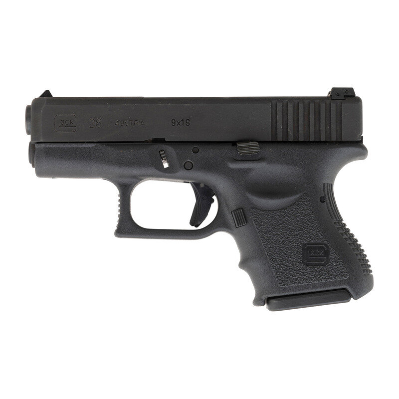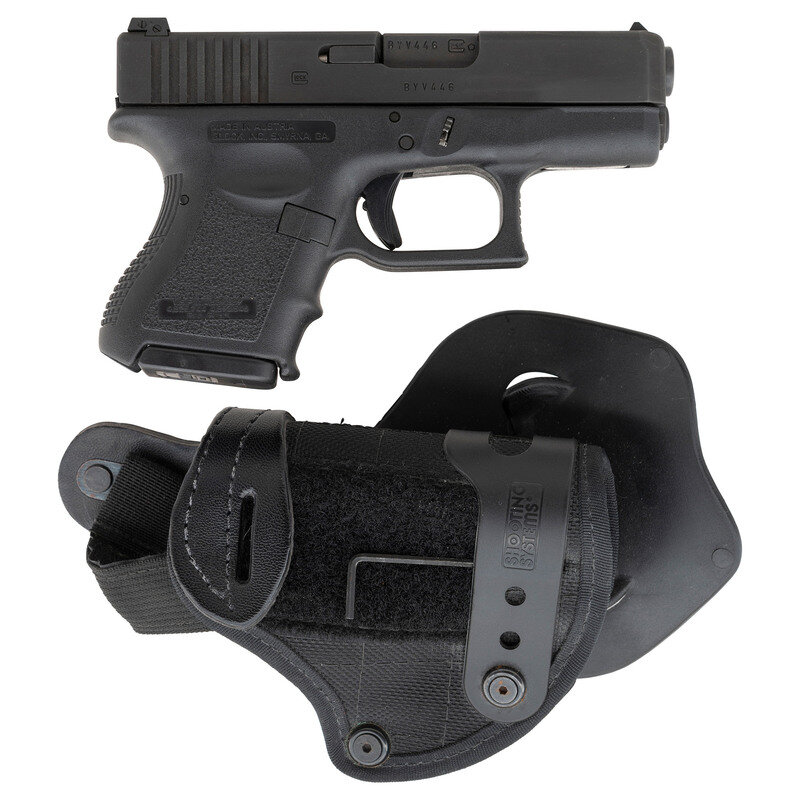 9mm Para. 3.43" barrel length. SN: BYV446US. Black Parkerized metal finish in black synthetic frame featuring synthetic adjustable target rear notch and front blade sights. Short recoil operated striker action subcompact pistol fed by detachable double stack magazines. Item shows standard Glock Austria markings. Comes with a SHOOTING/SYSTEMS outside waistband black synthetic, leather, and nylon holster. {MODERN}