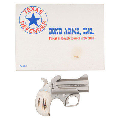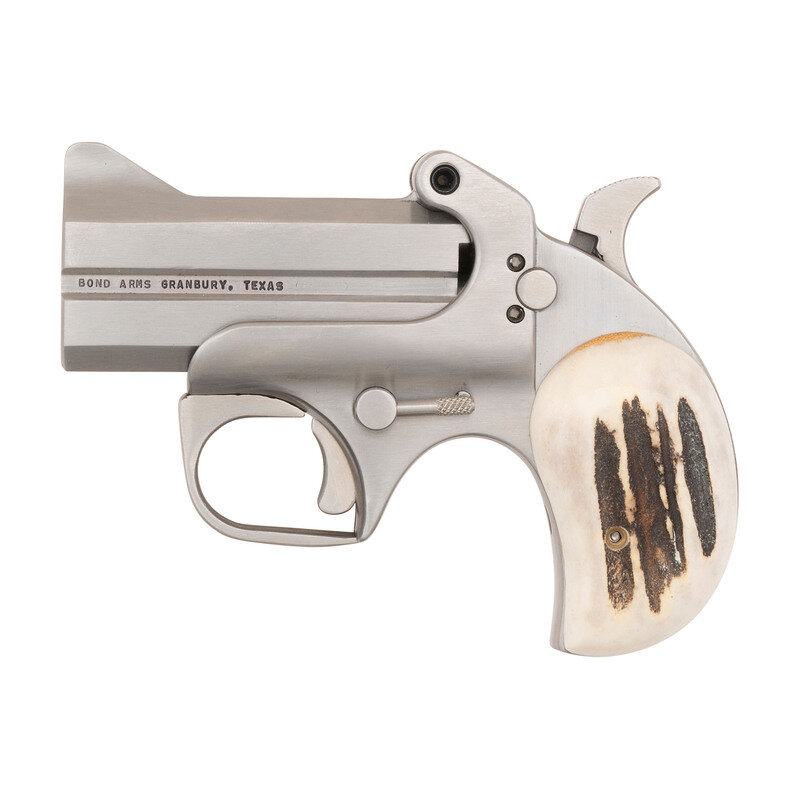 .450 Bond Super and .45LC/.410. 3" octagonal barrels. SN: 5352. Bright stainless steel finish, stag horn grip panels. Single action over and under two shot tip up barrel derringer pistol. Two barrel set in factory box, spare barrels are for .45 Colt/.410 Shotgun. A spare set of factory smooth wood grips are also included in the box. {MODERN}