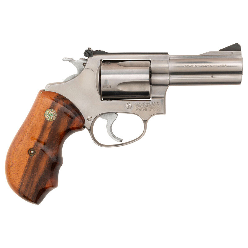 .38 Special. 3" barrel. SN: BFV2604. Bright stainless finish, matted and grooved topstrap, smooth finger groove varnished S&W medallion grips. Double action hand ejector revolver with fluted 5-chambered swing out cylinder, adjustable notch rear sight and ramped serrated front sight, .35" checkered hammer spur and .35" grooved trigger. Includes the blue plastic S&W box and factory paperwork. {MODERN}