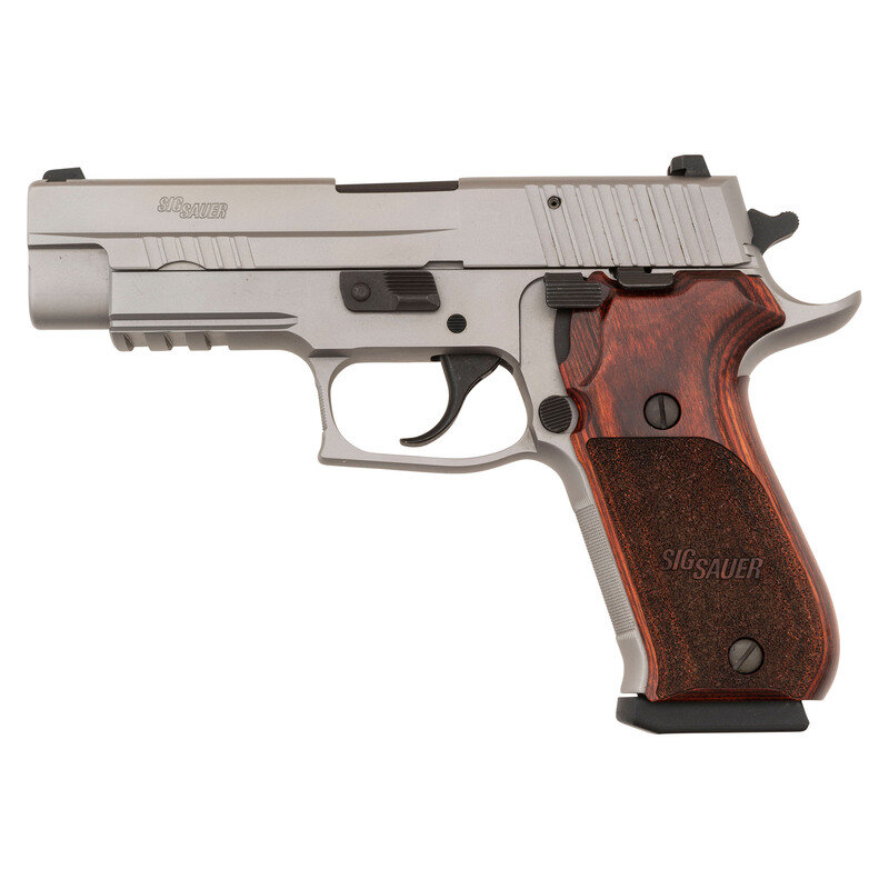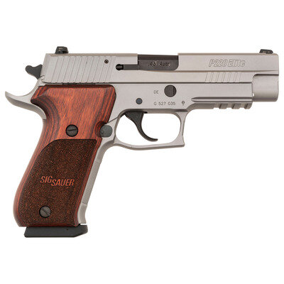 .45 ACP. 4.4" barrel length. SN: G527035. Matte stainless finish overall with blued small parts mounting laminated wood SIGSAUER logo grips, tritium triple dot night sights, and front and rear cocking serrations. Short recoil operated DA/SA autoloading pistol fed by detachable single stack magazines. Item features an accessory rail to the forward frame. Standard German production markings with P220 ELITE mark to right slide. {MODERN}