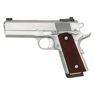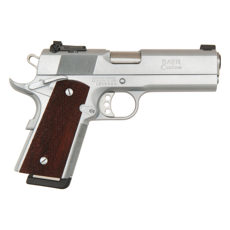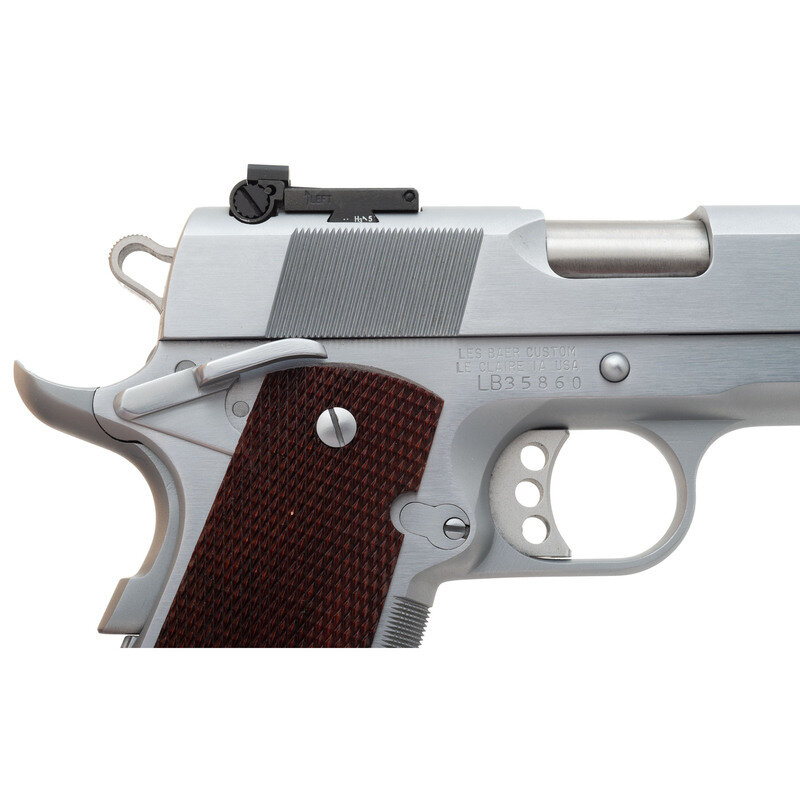 .45 ACP. 4.25" barrel. SN: LB35860. Hard chrome finish, top of slide matted, blued barrel, checkered hardwood grips. Single action Browning design tilting barrel short recoil semi-automatic pistol built by Les Baer Custom. Features include extended full size dust cover, checkered flat mainspring housing, checkered front strap, rear cocking serrations, extended beavertail grip safety with palm swell, skeletonized Commander hammer, serrated ambidextrous safety, Les Baer three dot night sights with adjustable rear and dovetailed front blade and skeletonized aluminum match trigger with over travel adjustment. Like all Les Baer pistols the fit and finish is top notch with extremely tight tolerances that result in a 3" group guarantee at 50 yards but also require several hundred rounds for break in to be 100% reliable. Pistol is in nearly new condition in factory box with a spare set of SGM grips, a total of two magazines, factory paperwork and a gun lock. The current base retail price for a Monolith Stinger is $3,887, not counting the upgrade to hard chrome, adjustable night sights, etc. {MODERN}