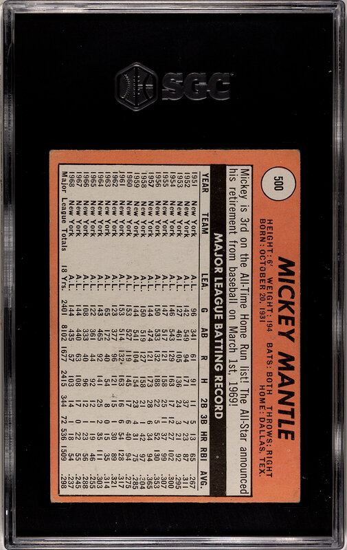 A 1969 Topps Mickey Mantle Baseball Card No. 500 (SGC 3 VG)