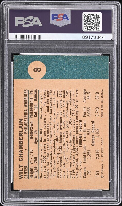 A 1961 Fleer Wilt Chamberlain Rookie Basketball Card No. 8 (PSA 6 EX-MT)