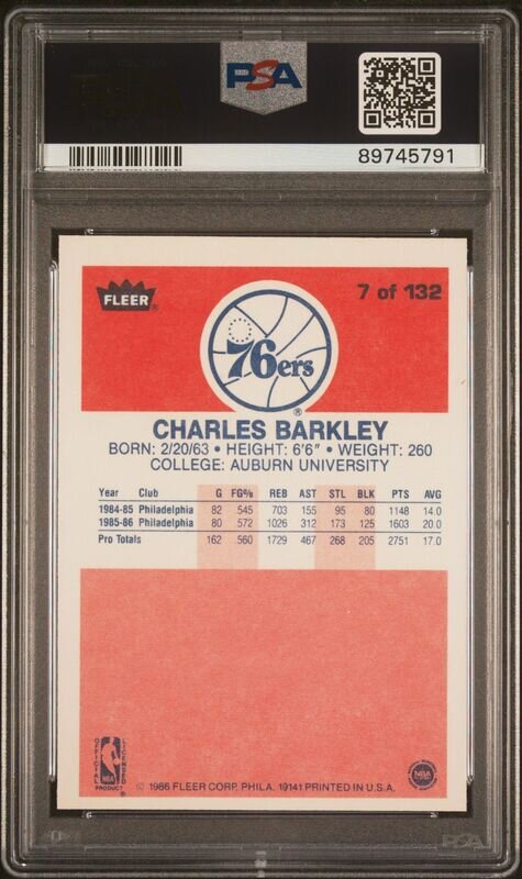 A 1986-87 Fleer Charles Barkley Rookie Basketball Card No. 7 (PSA 9 MINT)