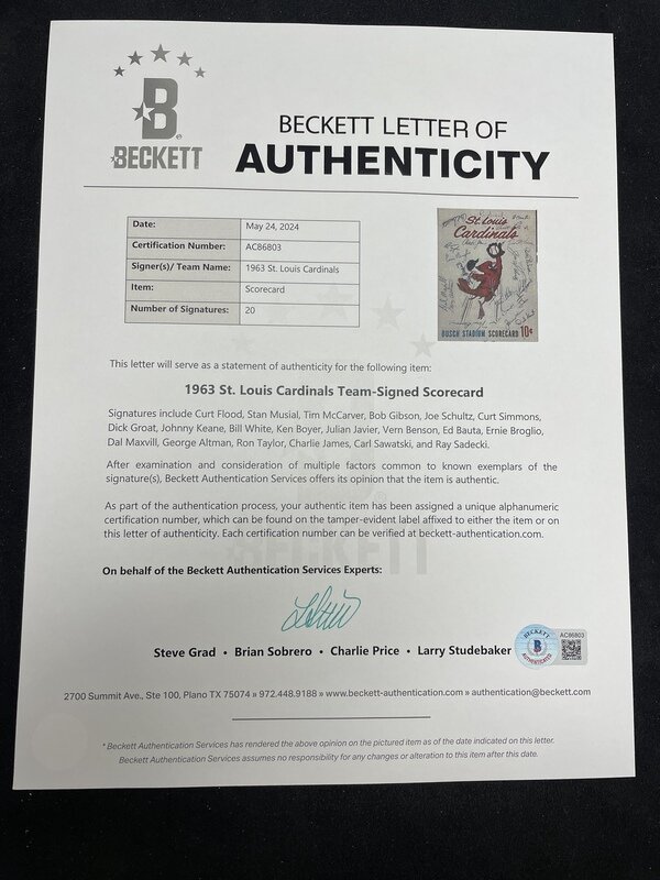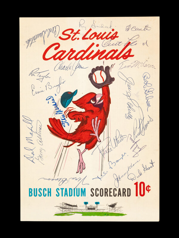 comprising signatures of Curt Flood, Stan Musial, Tim McCarver, Bob Gibson, Joe Schultz, Curt Simmons, Dick Groat, Johnny Keane, Bill White, Ken Boyer, Julian Javier, Vern Benson, Ed Bauta, Ernie Broglio, Dal Maxvill, George Altman, Ron Taylor, Charlie James, Carl Sawatski and Ray Sadecki.