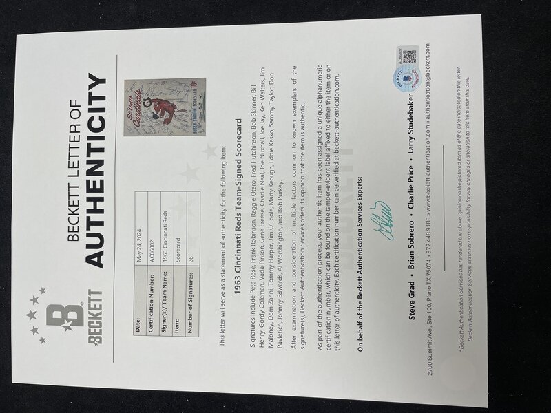 comprising signatures of Pete Rose, Frank Robinson, Reggie Otero, Fred Hutchinson, Bob Skinner, Bill Henry,Gordy Coleman, Vada Pinson, Gene Freese, Charlie Neal, Joe Nuxhall, Joe Jay, Ken Walters, Jim Maloney, Dom Zanni, Tommy Harper, Jim O'Toole, Marty Keough, Eddie Kasko, Sammy Taylor, Don Pavletich, Johnny Edwards, Al Worthington and Bob Purkey.