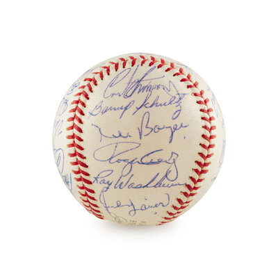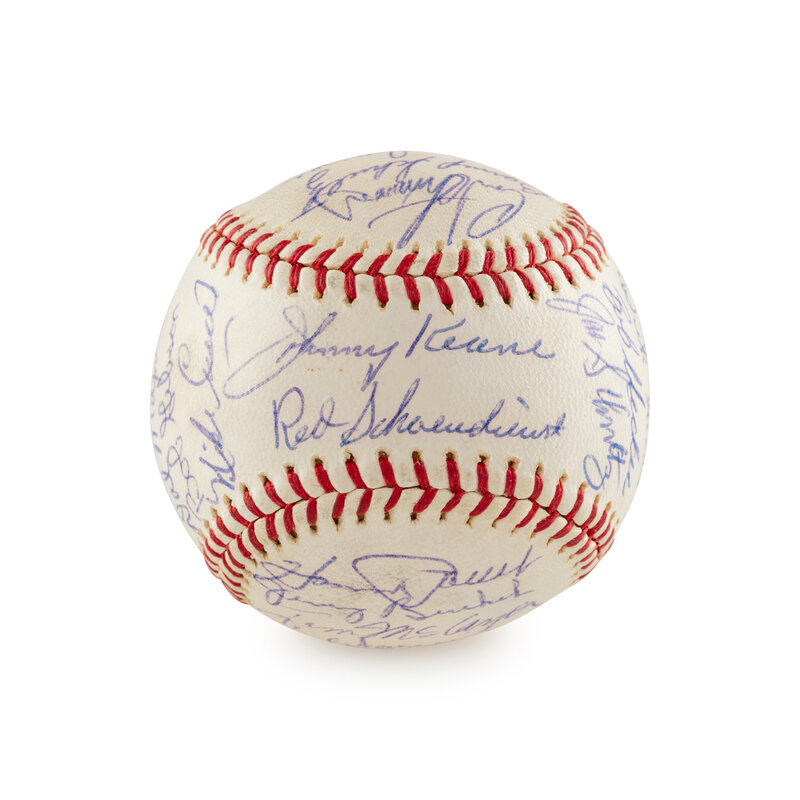 comprising signatures of Johnny Keane, Red Schoendienst, Curt Simmons, Barney Schultz, Ken Boyer, Roger Craig, Ray Washburn, Julian Javier, Lou Brock, Ray Sadecki, Charlie James, Carl Warwick, Tim McCarver, Jerry Buchek, Howie Pollet, Bill White, Bob Skinner, Ed Spiezio. Dal Maxvill, Bob Gibson, Mike Cuellar, Bob Humphreys, Curt Flood, Vern Benson, Dick Groat, Bob Uecker and Joe Schultz.