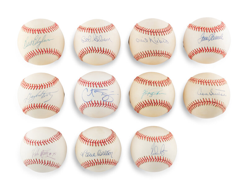 comprising 11 signed baseballs: Bert Blyeven; Steve Carlton; Bob Gibson; Fergie Jenkins; Pedro Martinez; Phil Niekro; Gaylord Perry; Nolan Ryan; Curt Schilling; Tom Seaver; Don Sutton.