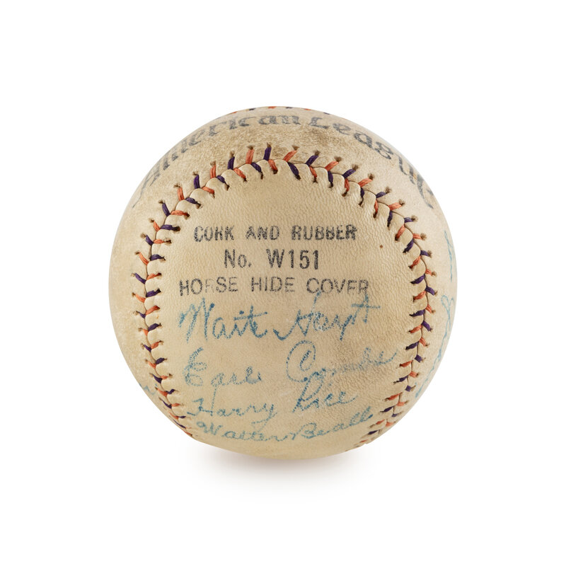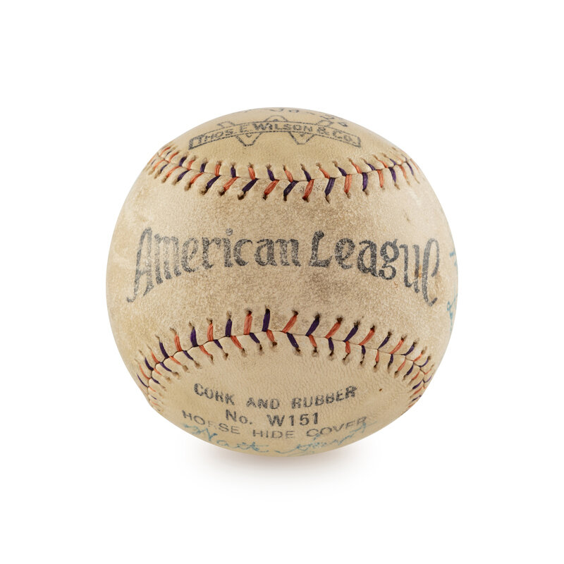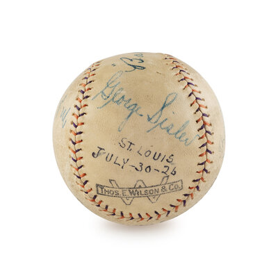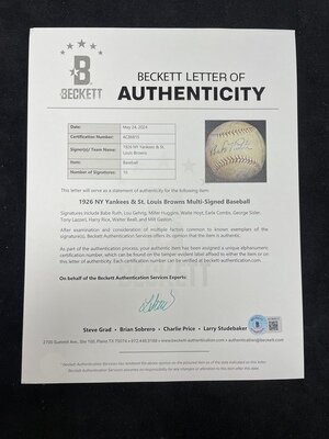 this impressive ball from the '26 campaign is highlighted by an exceptional sweet spot placement of the game's greatest legend – Babe Ruth. Complementing, the Babe's iconic signature are autographs of Yankees Hall of Famers Babe Ruth, Lou Gehrig, Miller Huggins, Waite Hoyt, Earle Combs, Tony Lazzeri with Walter Beall. Additional signatures feature St. Louis Browns greats George Sisler, Harry Rice, and Milt Gaston.