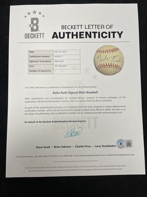 A Unique Babe Ruth Single Signed Autograph Mini Baseball (Beckett Authentication Services)