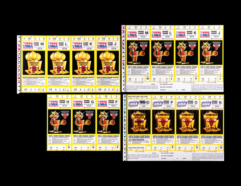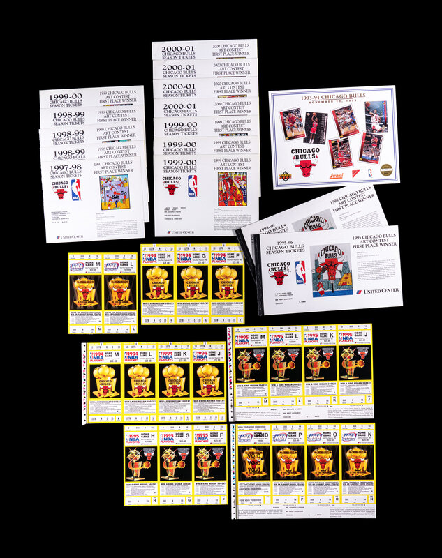 with 1994 NBA Playoffs Games F, G, H, J, K, L, M; 1995 NBA Playoffs Games F, G, H, J, K, L, M; 1996 NBA Playoffs Games L, M, N, O, P, VOID; 1993-94 Upper Deck/Jewel Stadium Handout; additional season ticket book covers from 1995-96 (x2), 1997-98, 1998-99 (x3), 1999-2000 (x4), 2000-01 (x4).