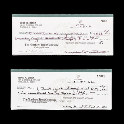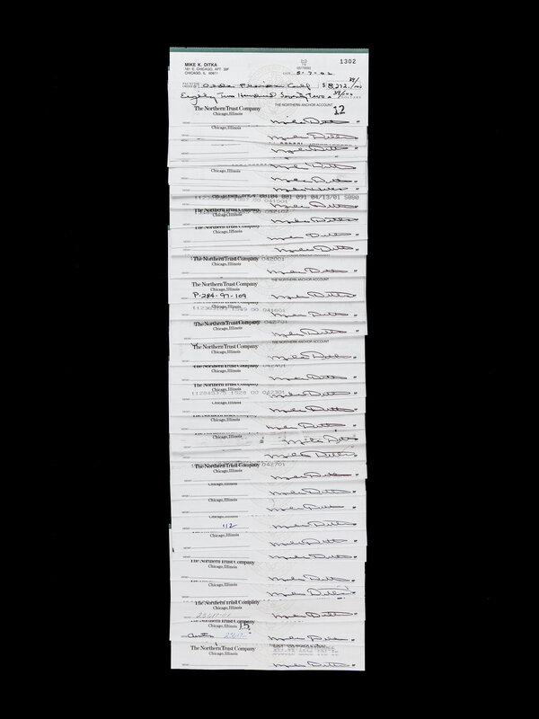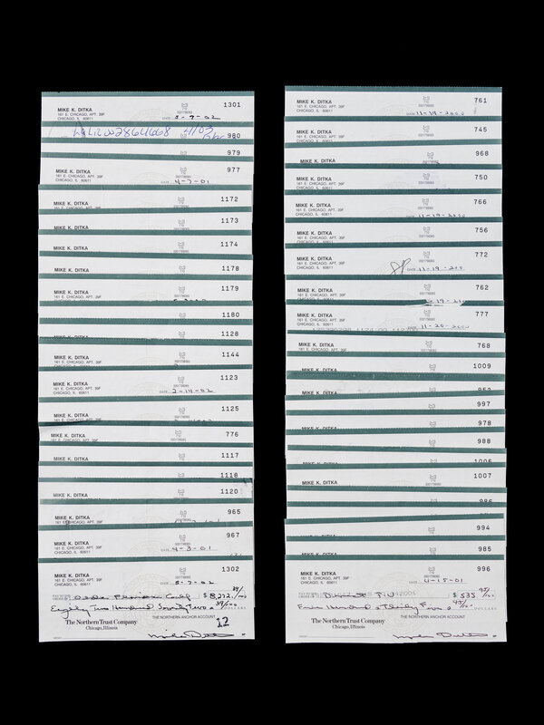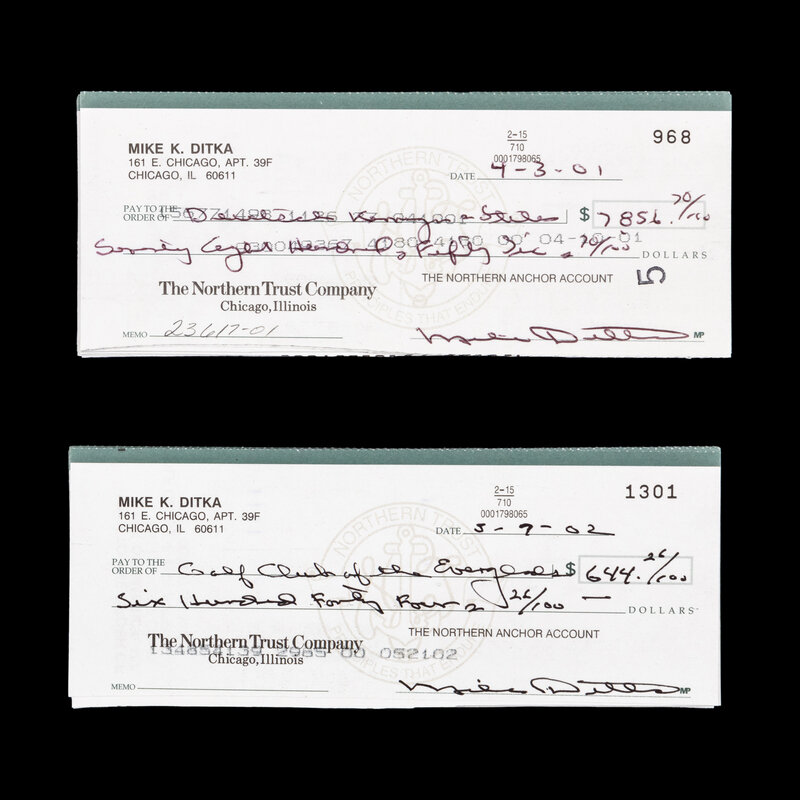 Cancelled handwritten checks in various amounts and made out to various institutions and individuals, each personally signed by Mike Ditka.