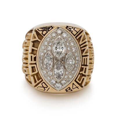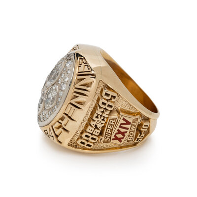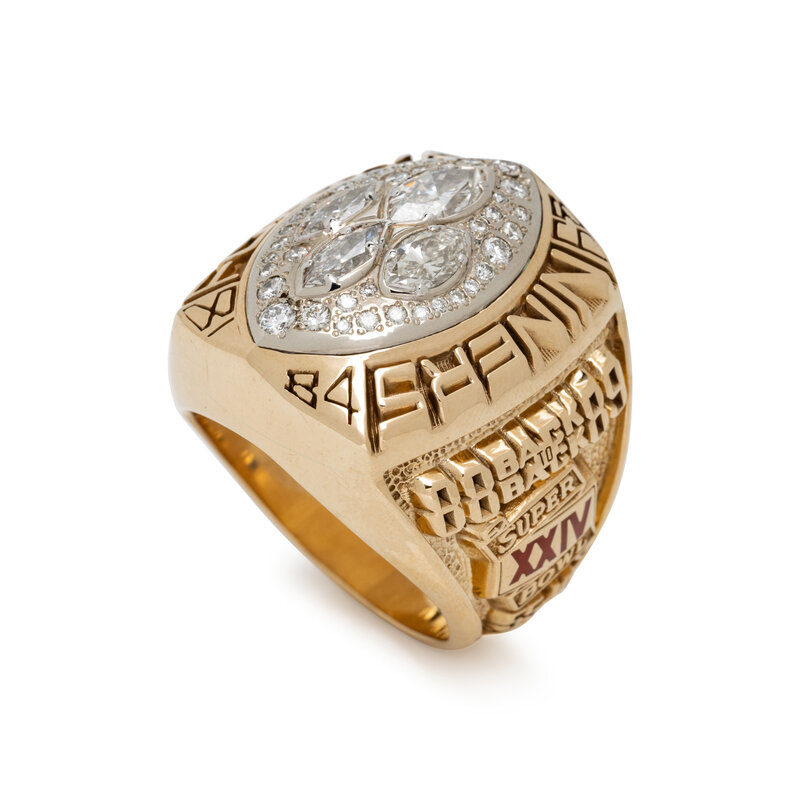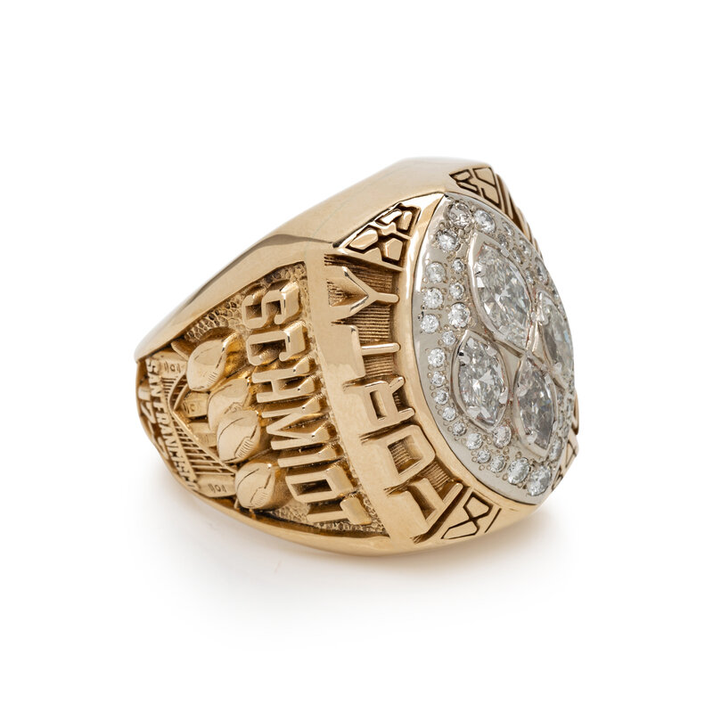 Recognizing Schmidt's important role, the ring's craftsmanship is identical to player models. The ring's face is adorned with genuine diamonds, with four larger football-shaped stones representing the four Lombardi Trophies earned in the 1980s.