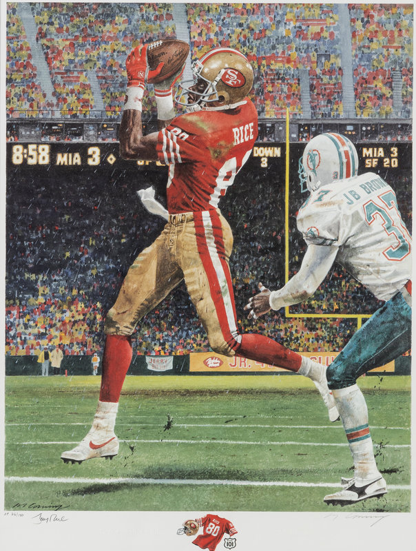 inscribed by the subject "Jerry Rice" and artist "Merv Corning" in pencil. Numbered AP26.