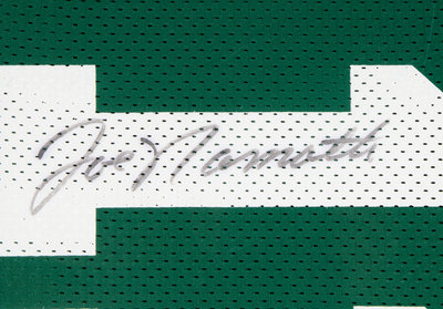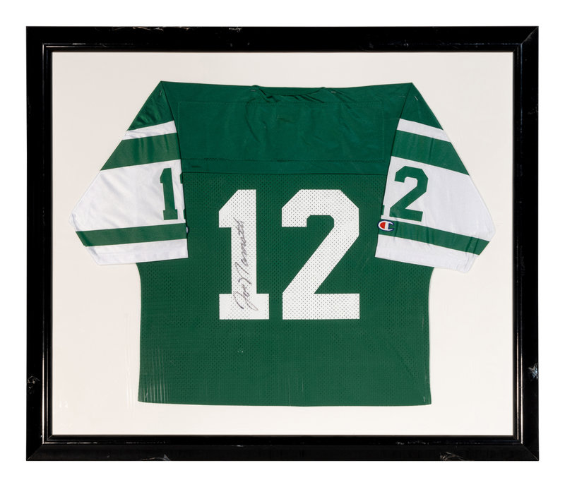 inscribed "Joe Namath" in black Sharpie inside number one on reverse of vintage Champion jersey.