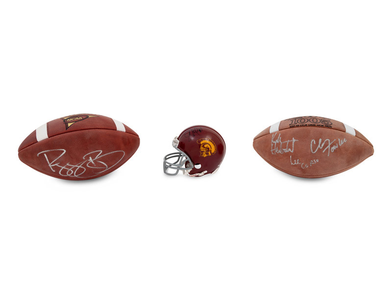 comprising a Chris Fowler, Kirk Herbstreit and Lee Corso signed football, a Reggie Bush signed autograph football and a Carson Palmer signed USC mini helmet.