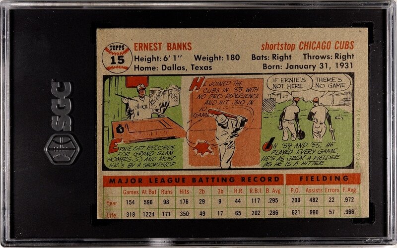 A 1956 Topps Ernie Banks Baseball Card No. 15 Gray Back (SGC 4.5 VG-EX+)