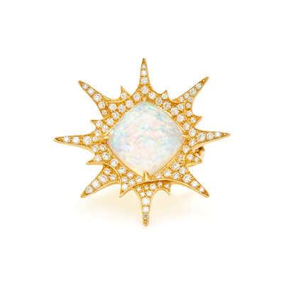 Faceted rock crystal quartz atop synthetic opal measuring approximately 12.00 x 12.00 mm, round brilliant cut diamonds. 18 karat yellow gold. Ring size 7.