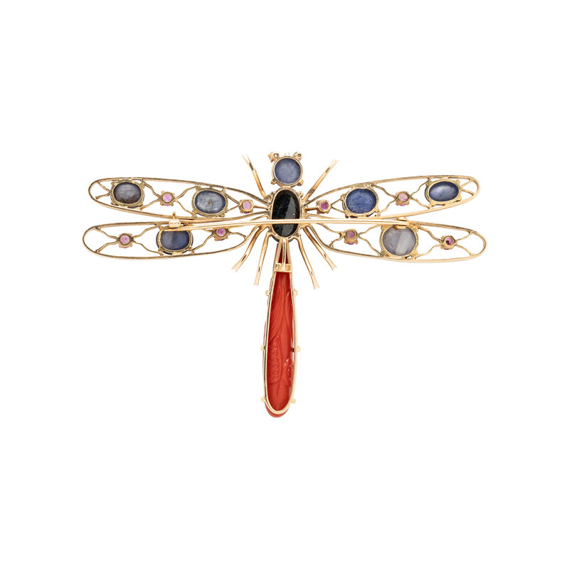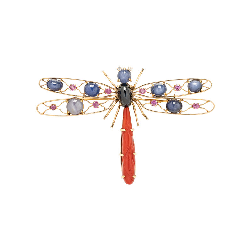 Oval and round cabochon star sapphires and pink sapphire wings, two round brilliant cut diamond eyes and carved coral body. 14 karat gold. 4 x 2 1/2 inches.