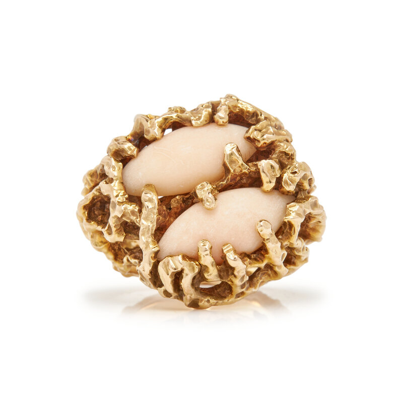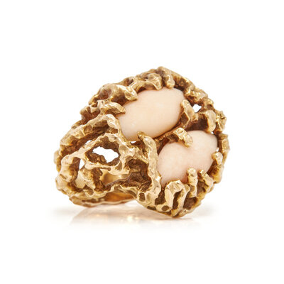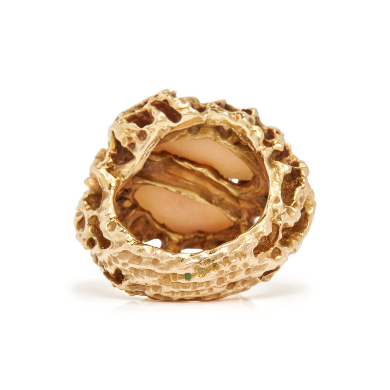 Brutalist style gold ring with marquise shaped angel skin coral cabochons. Ring size 6 1/2.