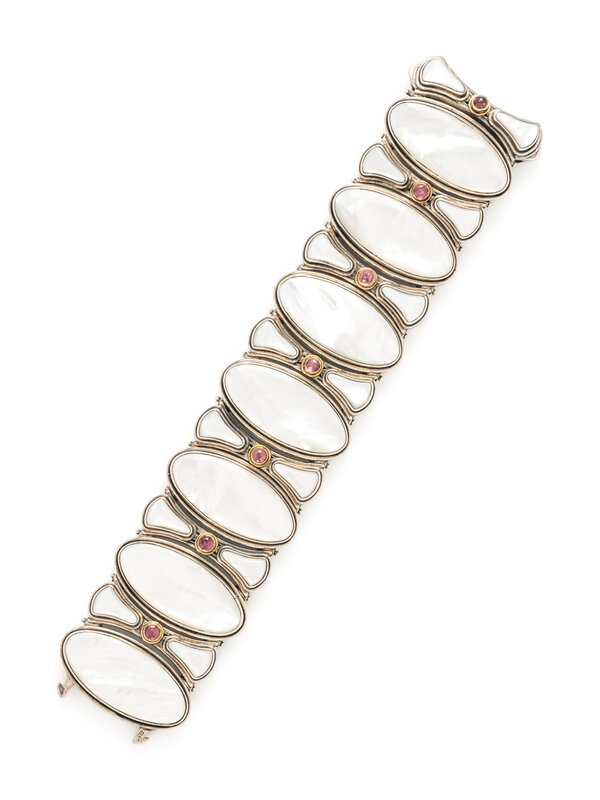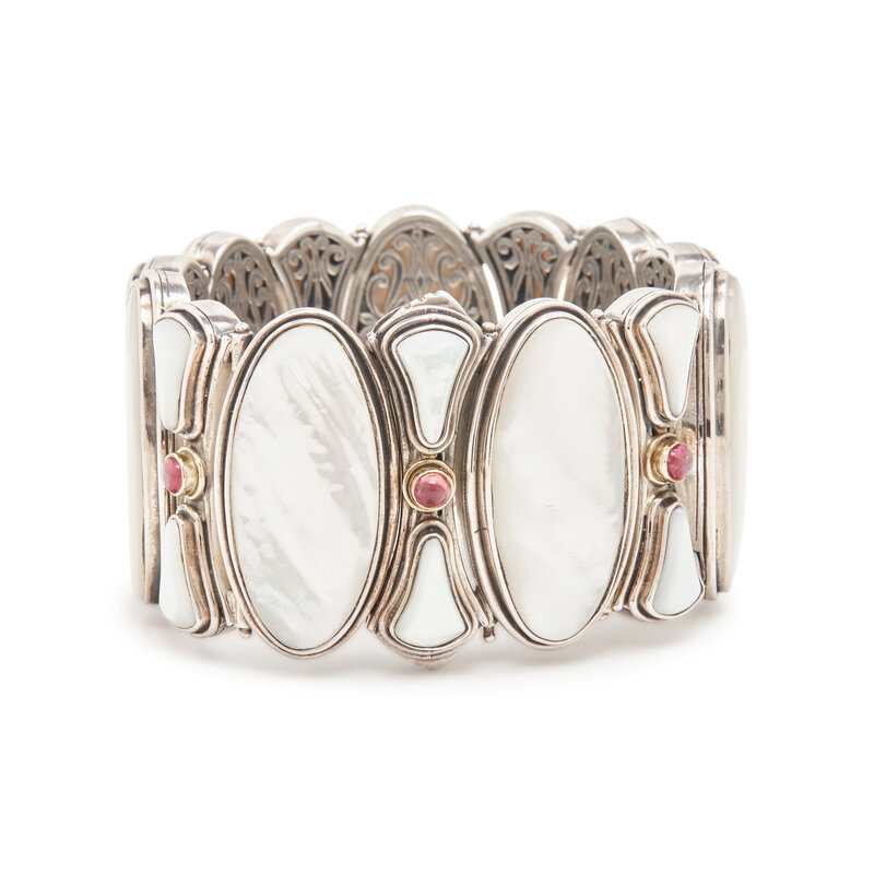 Mother-of-pearl and round cabochon pink tourmaline measuring approximately 3.20 mm. Sterling silver and 18 karat yellow gold. 7 1/4 inches long and 1 1/2 inches wide.