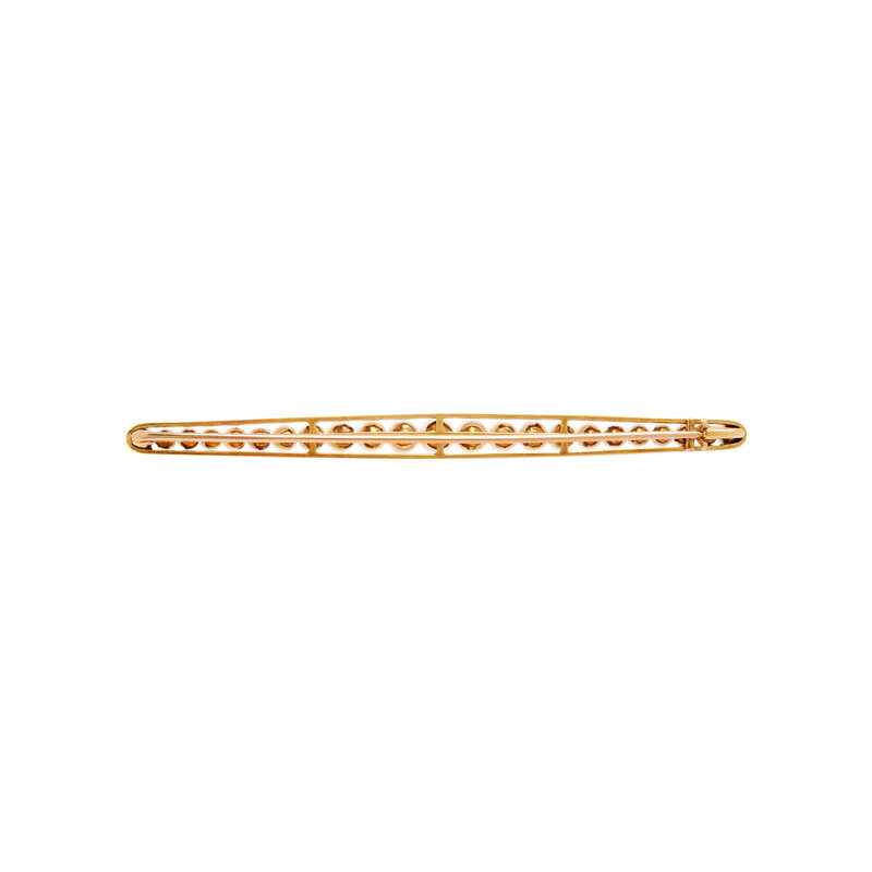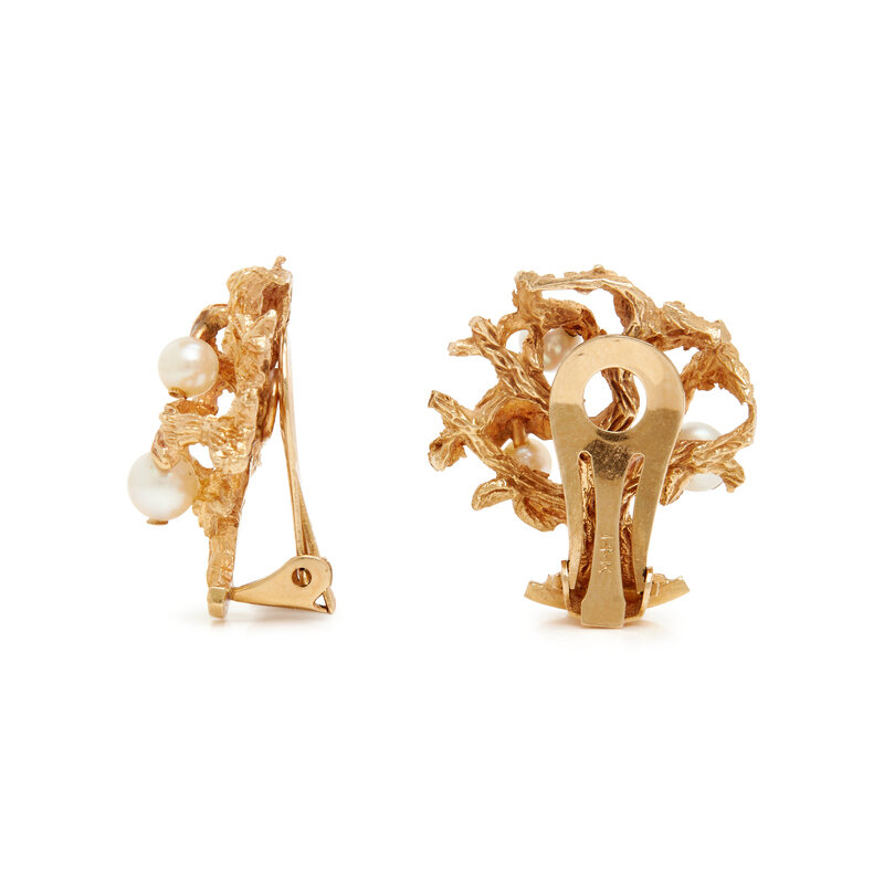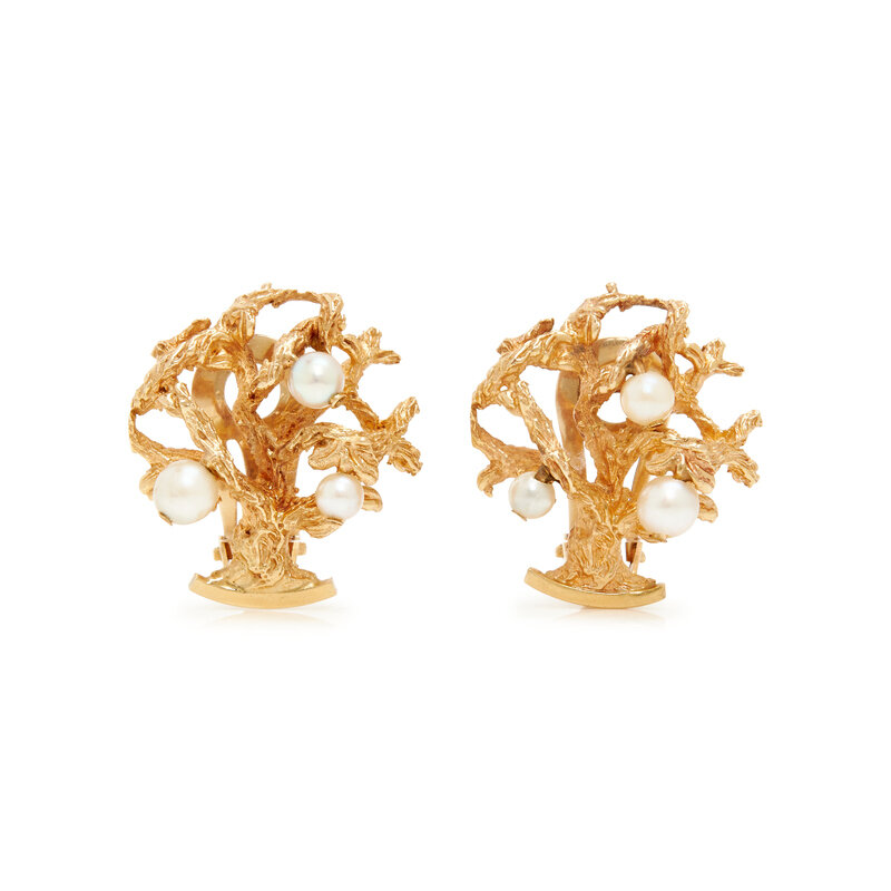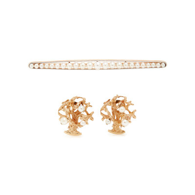 Consisting of a pair of yellow gold clip earrings and a platinum-topped yellow gold brooch. Yellow gold. Earrings: 1 inch long. Brooch: 3 3/8 inches long.