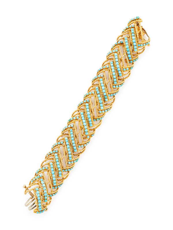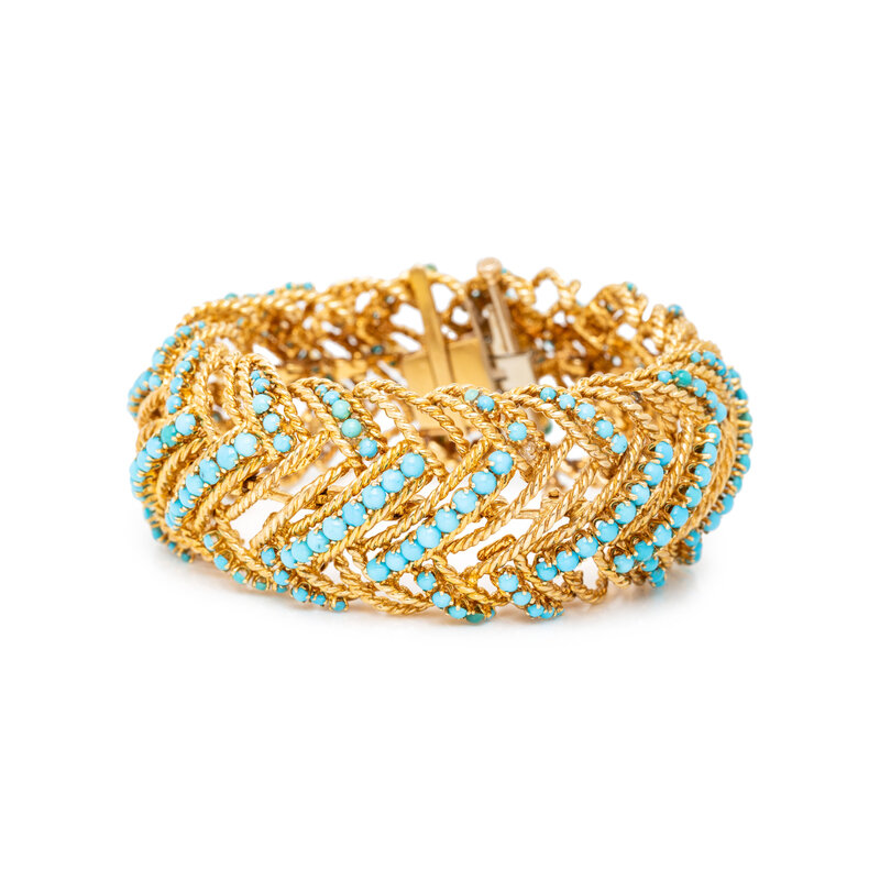 Round cabochon turquoise. Yellow gold. 7 1/2 inches long.