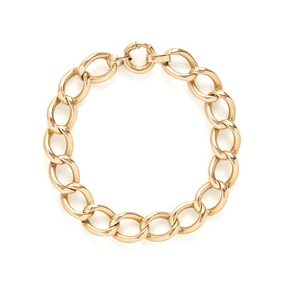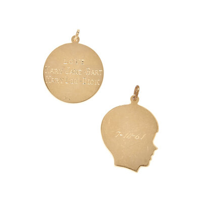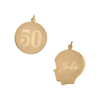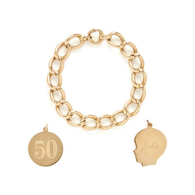 Curb link chain measuring approximately 12.00 mm, together with two engraved charms. 14 karat yellow gold. Chain: 8 inches long. Charms: 1 inch long.