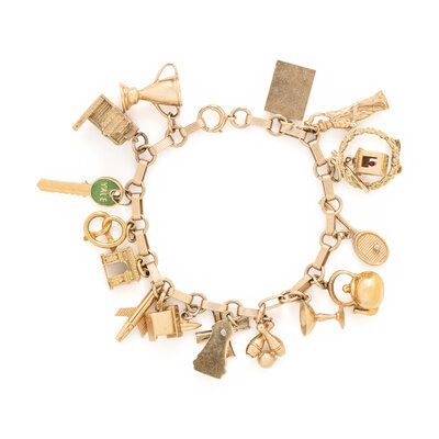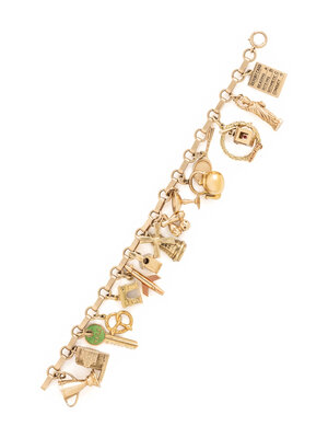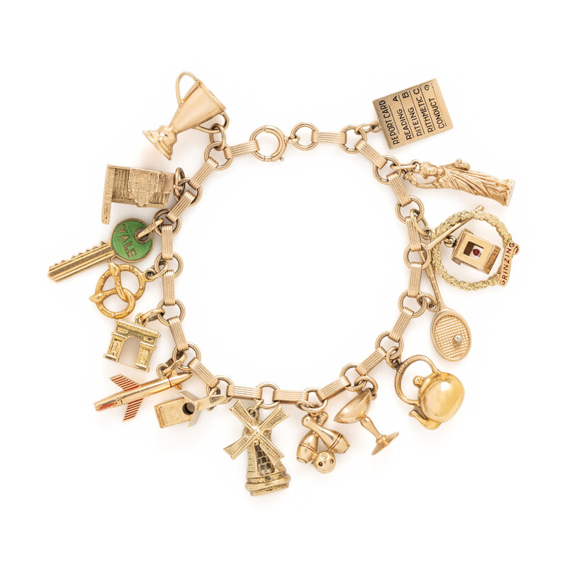 Charms include a report card, the Statue of Liberty, a Grinzing themed charm, tennis racket, tea kettle, goblet, bowling, windmill, schoolhouse, airplane, Champs-Élysées, pretzel, Yale key, Winchester Abbey, and a trophy, some of which have colored enamel accents. Yellow gold. 7 inches long.