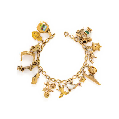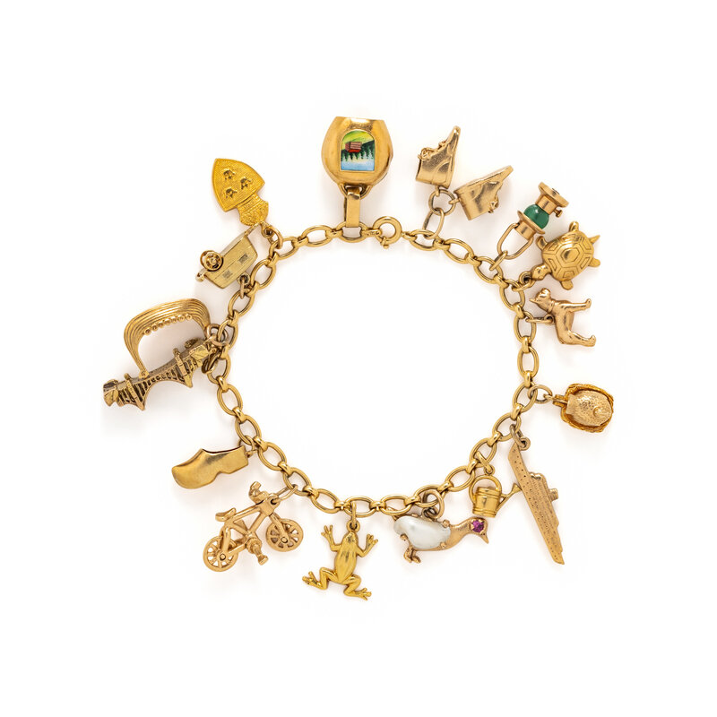 Charms include baby shoes, lantern set with a chrysoprase bead, turtle, dog, chicken set with seed pearls, steamboat, watering can, duck set with pearl and round cut pink sapphire, frog, bicycle, clog, Golden Gate Bridge, camper van, crest shield, and enameled bell. Yellow gold. 7 inches long.