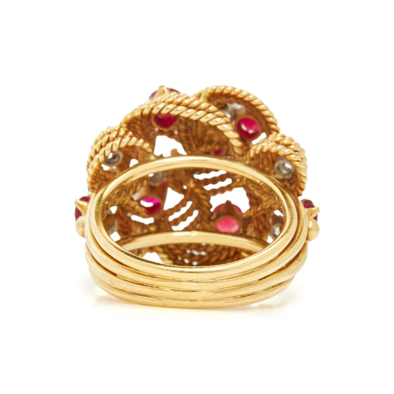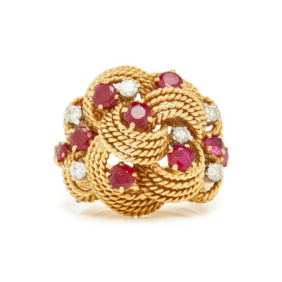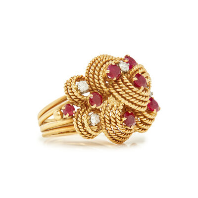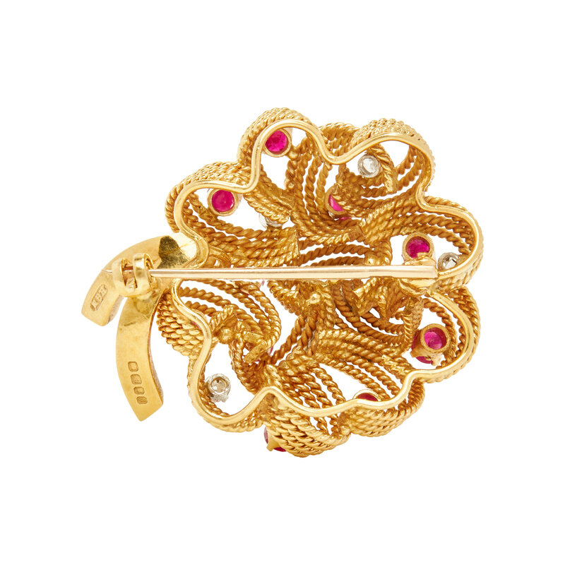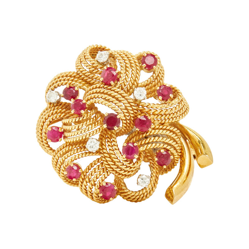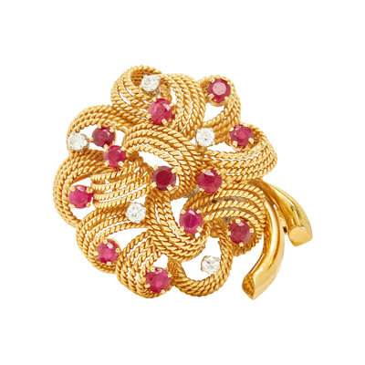 Brooch and ring with round brilliant cut diamonds and round mixed cut rubies. 18 karat yellow gold. Brooch: 1 1/4 inches wide. Ring size 6.
