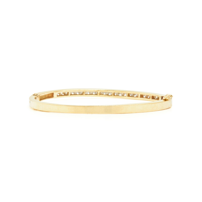 Round brilliant cut diamonds weighing approximately 1.40 carats total, hinged with side clasp. 14 karat yellow gold. 6 1/2 inches inner circumference.
