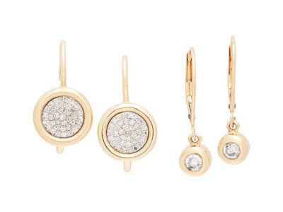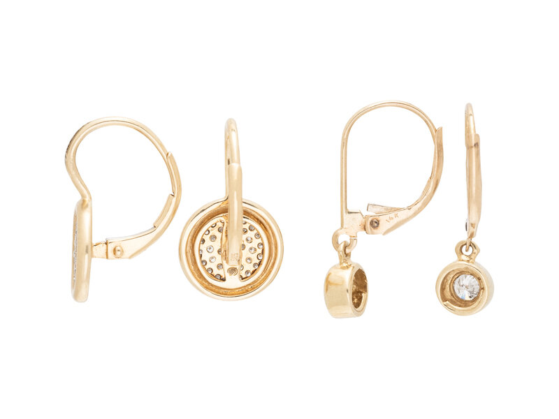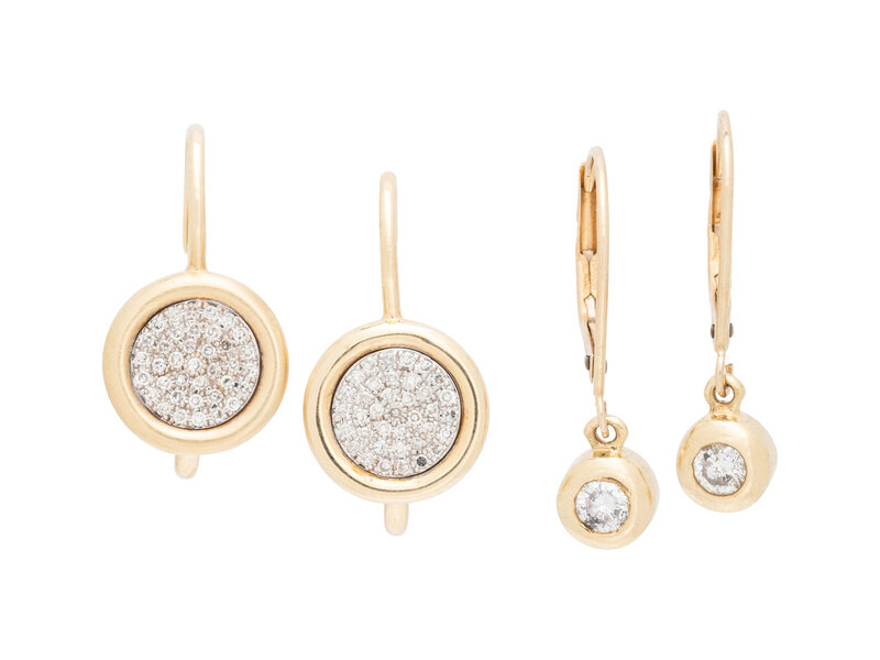 Consisting of a pair of earrings set with single cut diamonds, together with a pair of earrings containing two bezel set round brilliant cut diamonds. 14 karat yellow gold. 3/4 inch long.