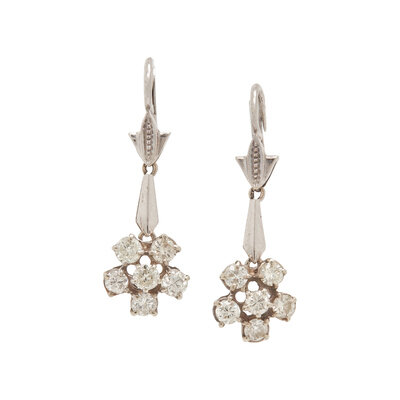 Round brilliant cut diamonds weighing approximately 1.90 carats total. 18 karat white gold. 1 3/8 inches long.