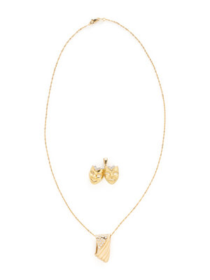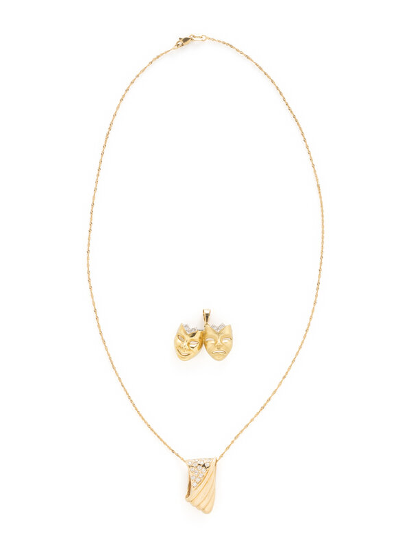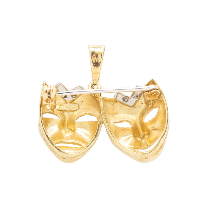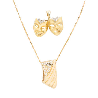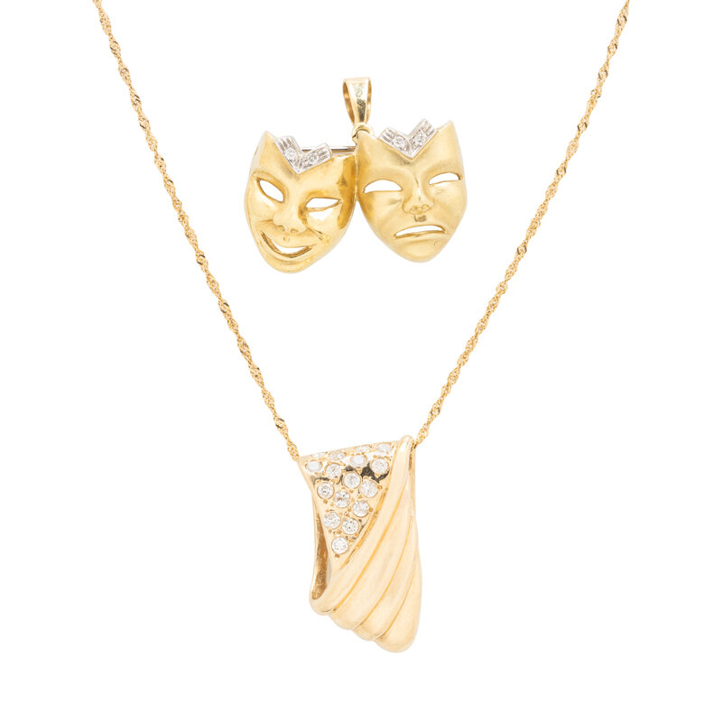 Consisting of a diamond pendant suspended from a rope link chain, together with a diamond mask pendant/brooch. 14 and 18 karat yellow gold. Pendant: 1 inch long. Chain: 19 1/2 inches long. Brooch: 1 x 3/4 inch.