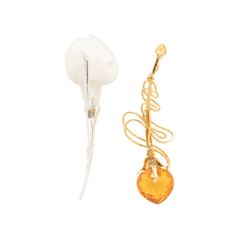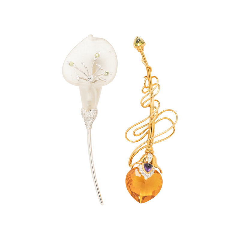 Consisting of a white gold brooch designed as a rock crystal orchid with round cut peridot and round brilliant cut diamonds, together with a yellow gold brooch containing one pear shaped citrine, one triangular amethyst and round brilliant cut diamonds. 4 inches long and 3 3/4 inches long.