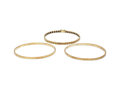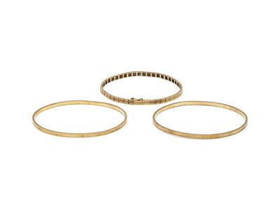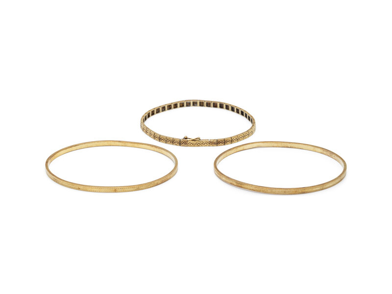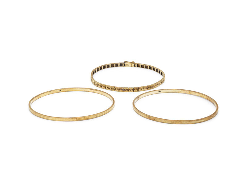 Including two bangle bracelets, and a flexible line bracelet. 14 karat yellow gold. Bangles: inner circumference 7 1/4 inches. Bracelet: length 7 1/4 inches.