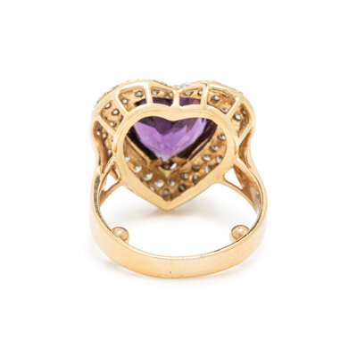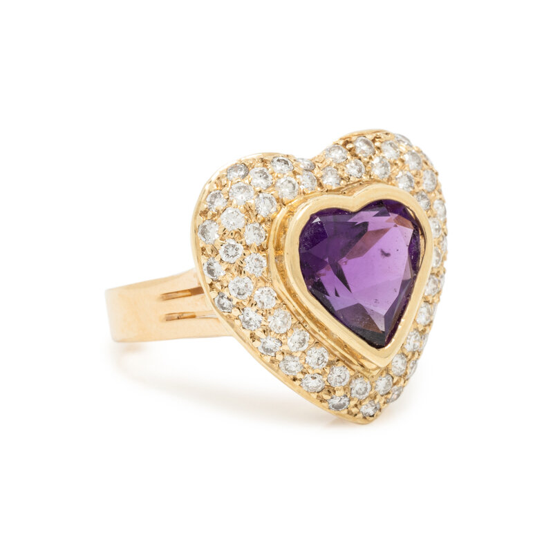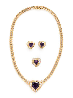 Consisting of a necklace, clip earrings and a ring, containing heart shaped amethysts, and square step and round brilliant cut diamonds weighing approximately 2.95 carats total. 14 karat yellow gold. Necklace: 16 inches long. Earrings: 5/8 inch long. Ring size 5 1/2.