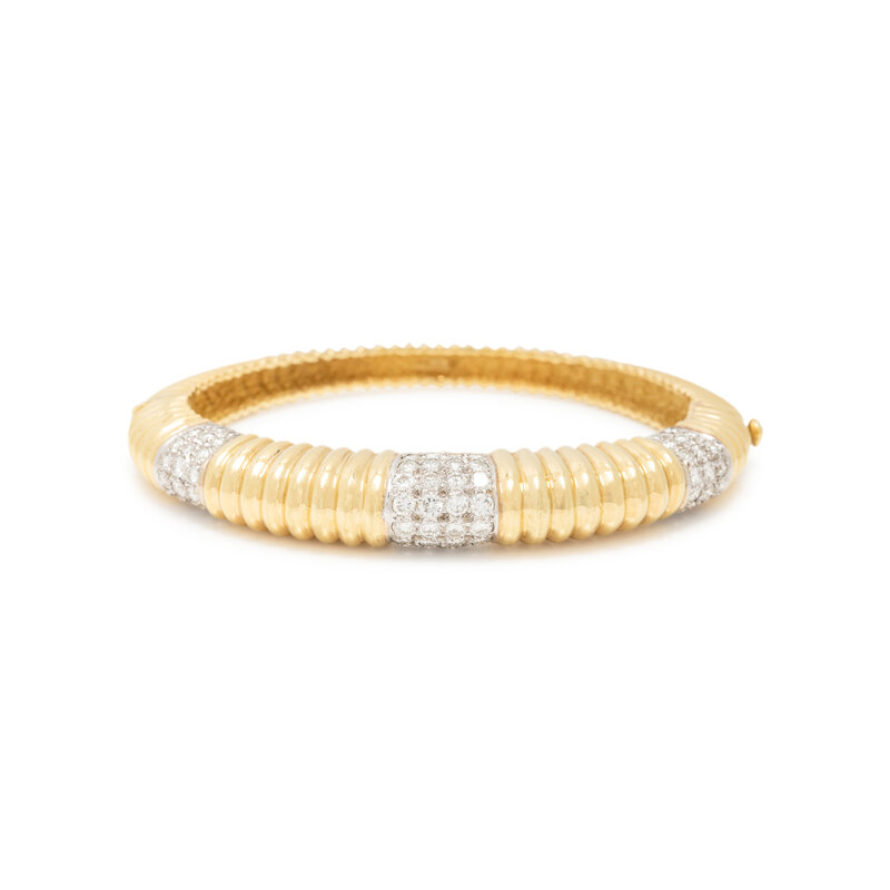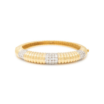 Round brilliant cut diamonds weighing approximately 3.00 carats total, hinged with side clasp. 18 karat yellow and white gold. 6 1/4 inches inner circumference.