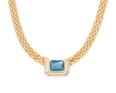 Emerald cut blue topaz measuring approximately 14.00 x 11.00 mm and round brilliant cut diamonds. 14 karat yellow and white gold. 16 5/8 inches long.