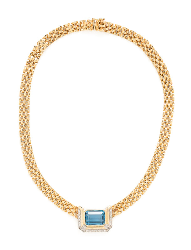 YELLOW GOLD, DIAMOND AND BLUE TOPAZ PENDANT NECKLACE