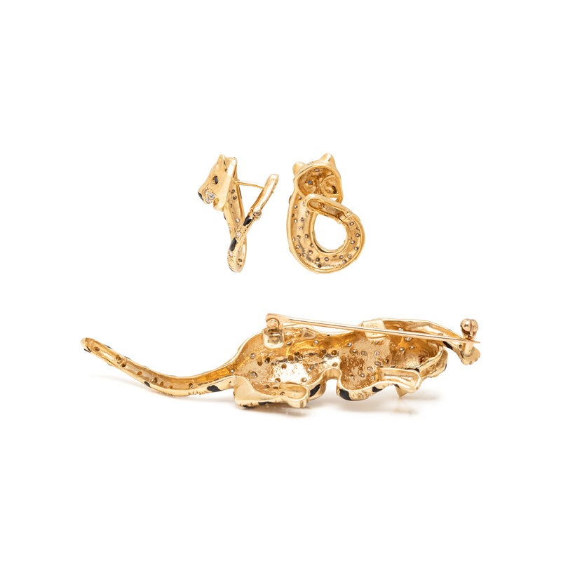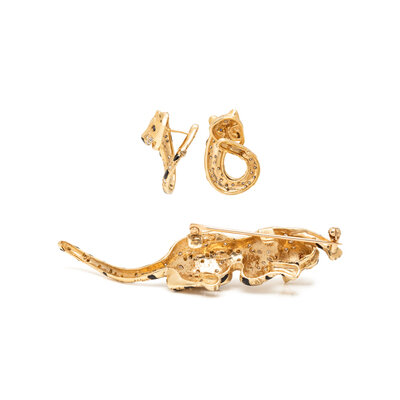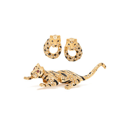 Consisting of a tiger brooch with round brilliant cut diamonds, black enamel stripes and round mixed cut rubies eyes, together with a pair of leopard earrings with round brilliant cut diamonds, black enamel spots and round sapphire eyes. Yellow gold. Brooch: 3 inches long. Earrings: 1 inch long.