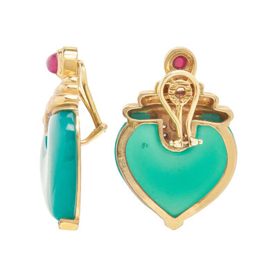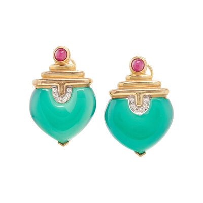 YELLOW GOLD, DYED GREEN CHALCEDONY, RUBY, AND DIAMOND EARRINGS