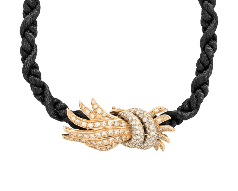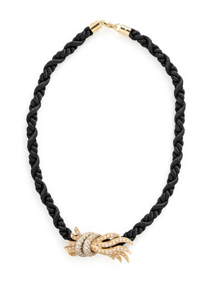 Consisting of a black cord necklace suspending an enhancer containing 116 round brilliant and single cut diamonds weighing approximately 1.70 carats total. Necklace: 17 inches long. Enhancer: 1 3/4 inches x 7/8 inch.