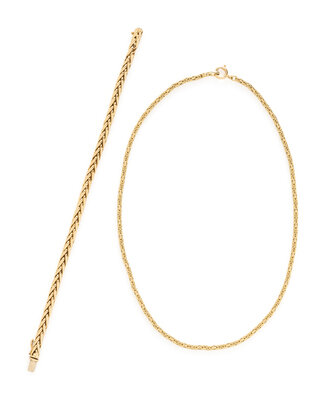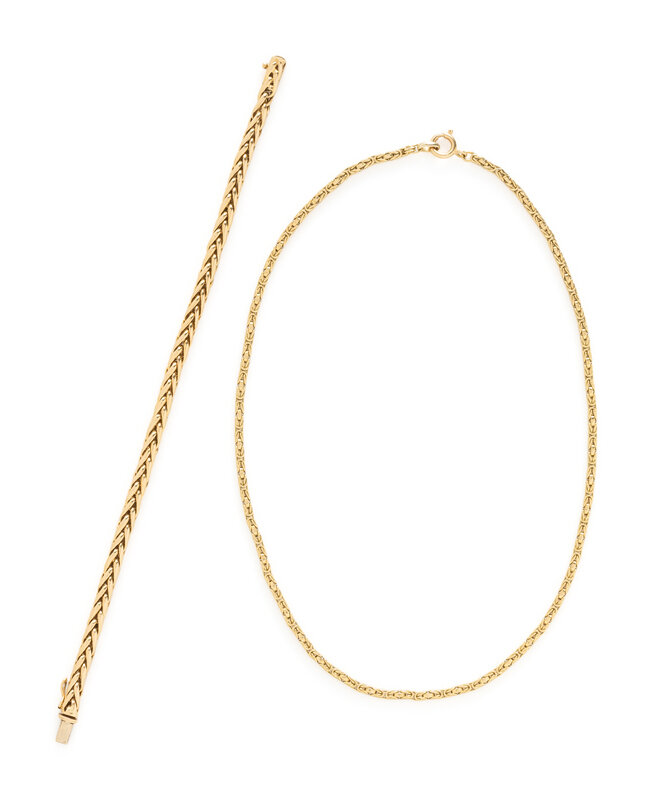 Consisting of a Byzantine link necklace measuring approximately 2.50 mm, together with a wheat link bracelet measuring approximately 4.50 mm. 18 karat yellow gold. Necklace: 16 inches long. Bracelet: 7 3/4 inches long.