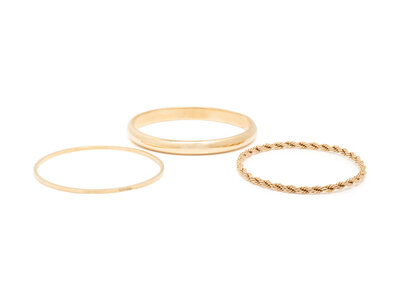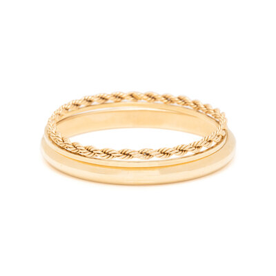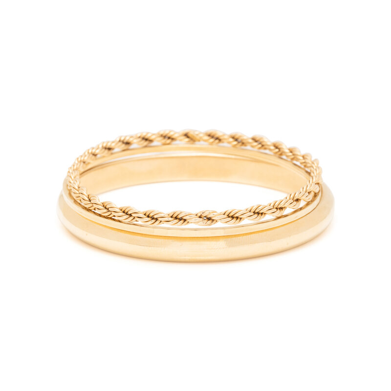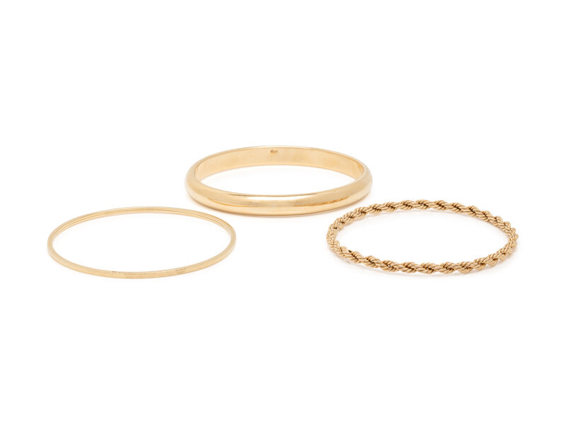 Consisting of a textured gold bangle measuring approximately 2.00 mm, a rope bangle measuring approximately 4.00 mm and a hollow gold bangle measuring approximately 8.00 mm. 14 karat yellow gold. 8, 7 3/4 and 7 3/4 inches inner circumference.