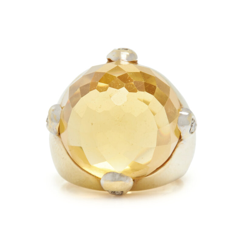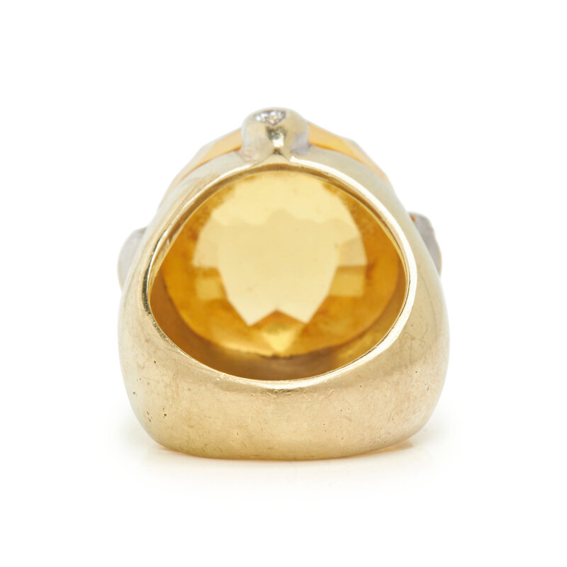 Round faceted dome citrine measuring approximately 17.50 x 11.65 mm and round brilliant cut diamonds. 14 karat yellow gold. Ring size 6 1/4.